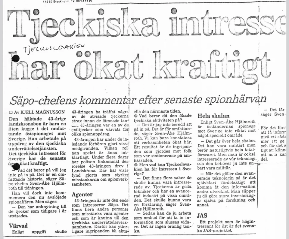 Švédsko dva mesiace po vražde premiéra Olofa Palmeho v roku 1986 uskutočnilo tichý, ale mimoriadne tvrdý zásah proti československej spravodajskej sieti. Päť československých diplomatov bolo vyhlásených za persona non grata a muselo do desiatich dní opustiť krajinu. Hoci Štokholm vtedy neuviedol dôvody, archívne dokumenty dnes ukazujú, že všetci vyhostení boli prepojení na civilnú aj vojenskú rozviedku ČSSR. Švédska kontrarozviedka SÄPO (Säkerhetspolisen) presne zacieleným krokom oslabila československé spravodajské aktivity. O prípade píše Petr Rendek na portáli INFO.CZ