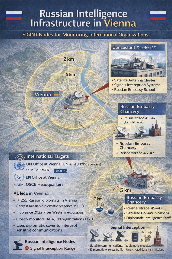 Ruská zahraničná spravodajská služba SVR (Služba vnešnej razvedki Rossijskoj Federacii) postupne premenila Viedeň na jedno z hlavných centier signálného spravodajstva (SIGINT) v Európe. Po roku 2022, keď viaceré štáty Európskej únie masovo vyhosťovali ruských diplomatov podozrivých zo špionáže, Moskva presunula svoje kapacity do miest, kde jej diplomatická prítomnosť zostala relatívne neobmedzená. Rakúsko, ktoré tradične uplatňuje mäkký prístup k diplomatickým misiám a zachováva politiku neutrality, sa tak stalo prirodzeným útočiskom pre reorganizáciu ruských spravodajských operácií.